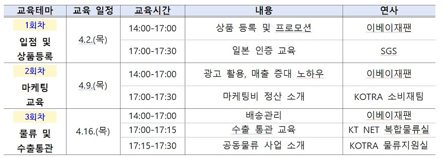 참여기업 모집을 안내드립니다. 본 사업은 일본 온라인 시장 진출을 희망하는 기업의 안정적인 입점과 초기 판매 기반 마련을 지원하기 위한 교육 프로그램으로, 실무 중심 커리큘럼과 함께 마케팅 비용 지원 혜택이 제공됩니다.